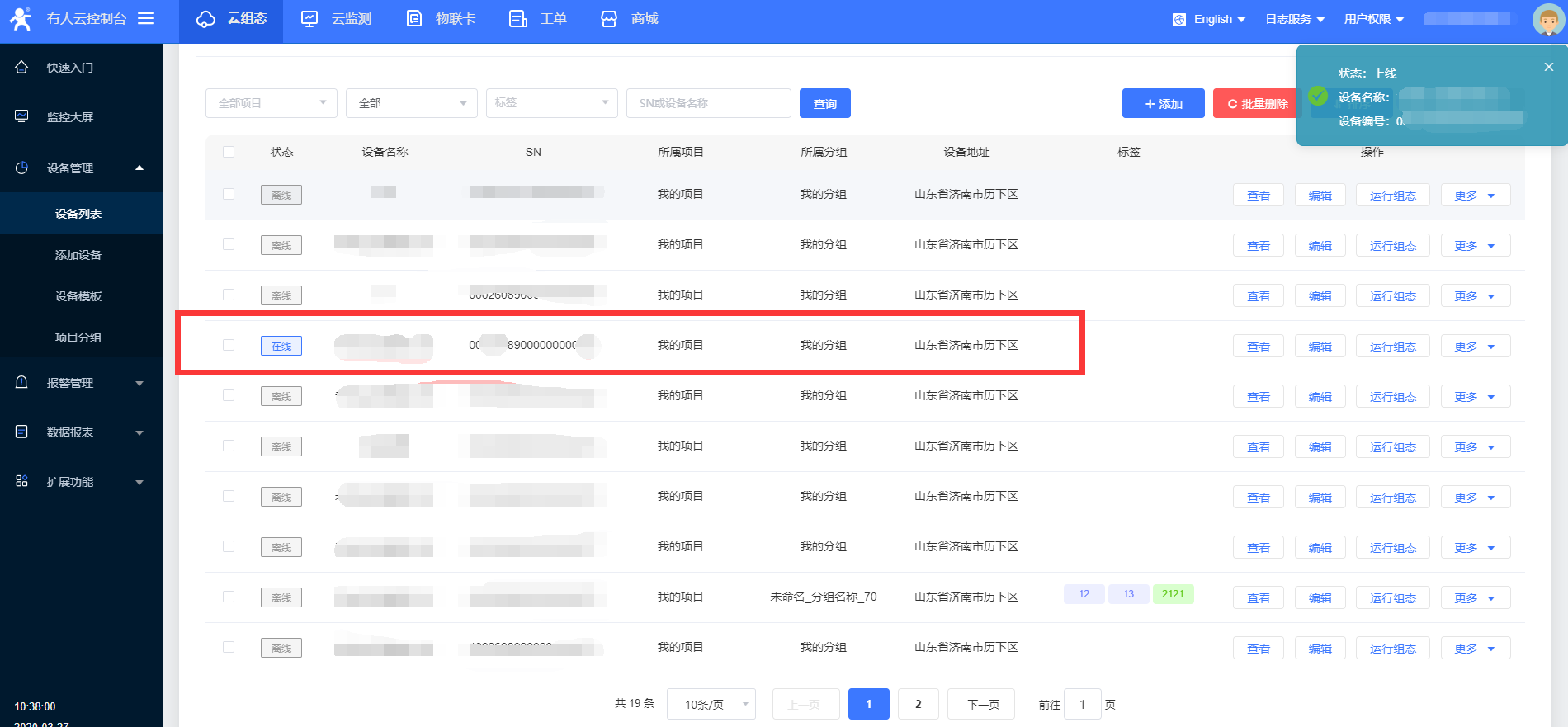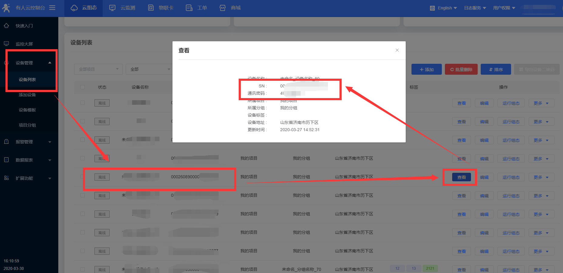 4、在設(shè)備管理》設(shè)備列表 可以看到添加的設(shè)備,點(diǎn)擊后面的查看,可以看到設(shè)備生成的編號(hào)及通訊密碼