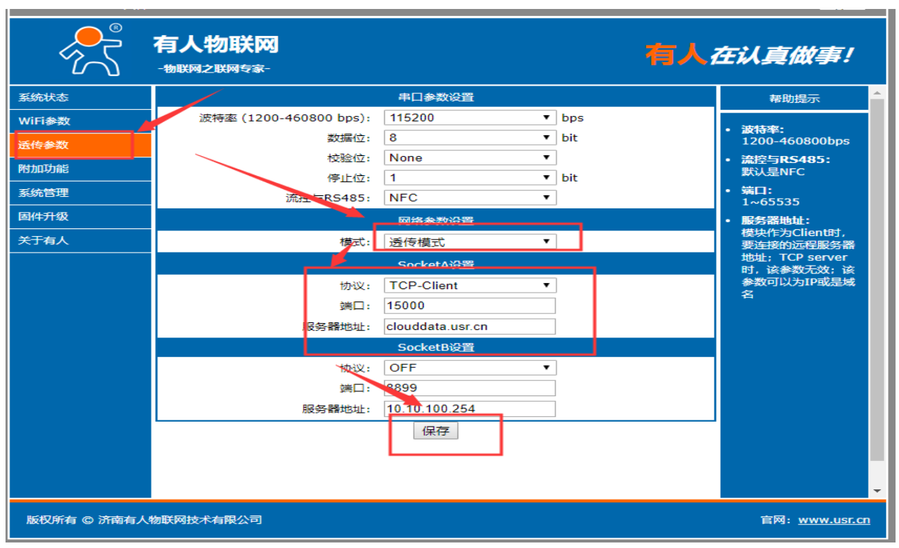 2、進(jìn)入內(nèi)置網(wǎng)頁(yè)(10.10.100.254)內(nèi)置網(wǎng)頁(yè)的賬號(hào)和密碼都是admin。進(jìn)入透?jìng)鲄?shù),選擇透?jìng)髂J?,服?wù)器地址:clouddata.usr.cn端口15000,保存