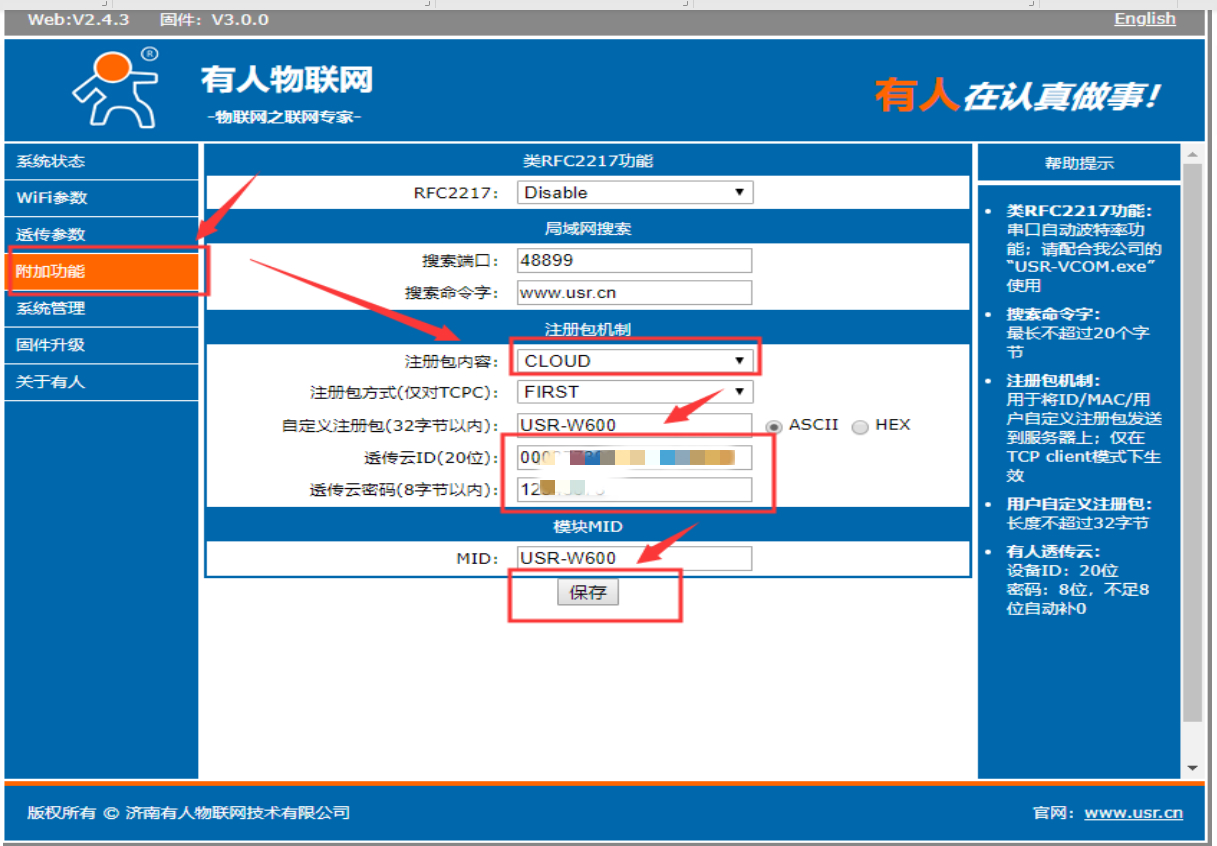 3、進(jìn)入附加功能,注冊(cè)包內(nèi)容:cloud,填上剛才在有人云上新添加的設(shè)備的編號(hào),和密碼,點(diǎn)擊保存