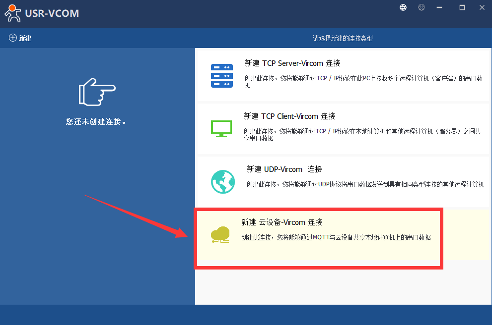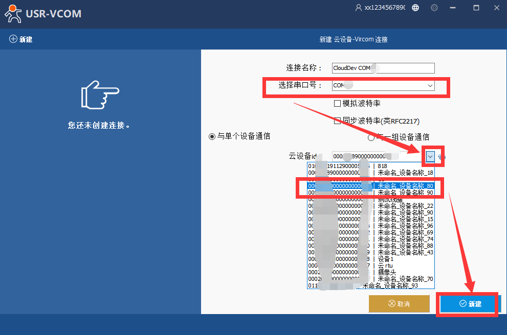 3、選擇一個(gè)不常用的串口號(hào),選擇云端剛才添加的設(shè)備,點(diǎn)新建,生成設(shè)備對(duì)應(yīng)的虛擬串口