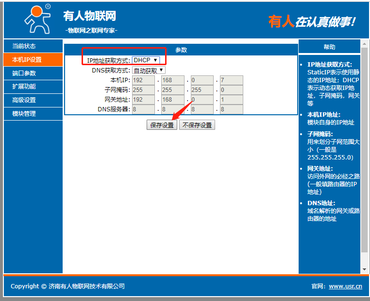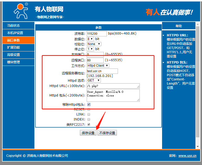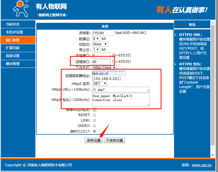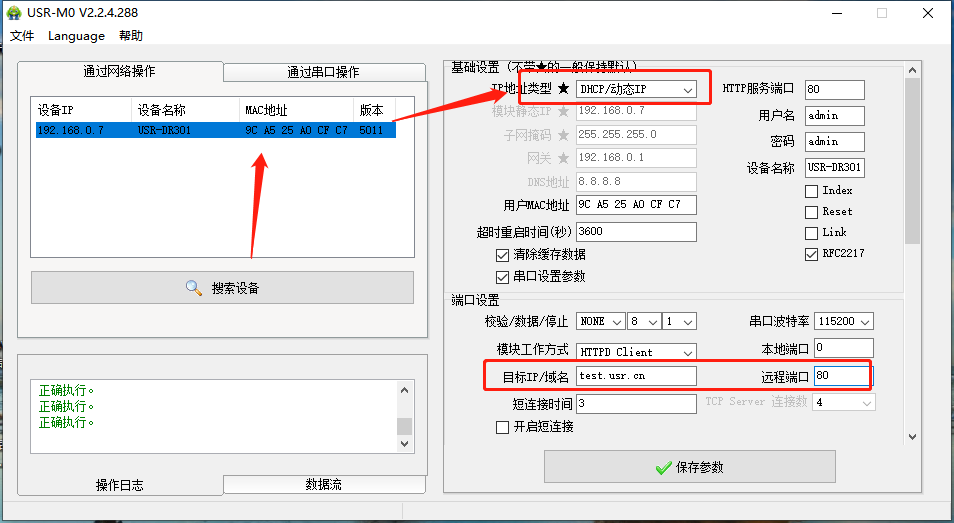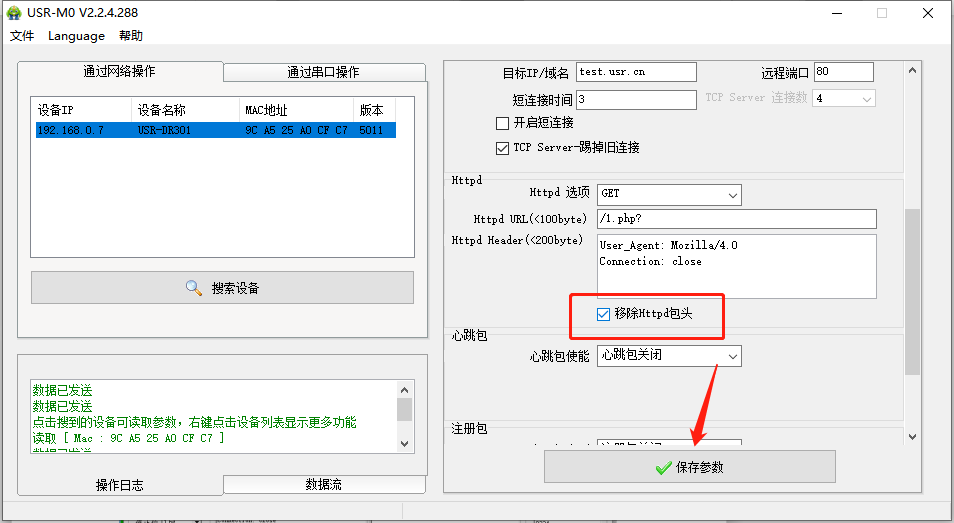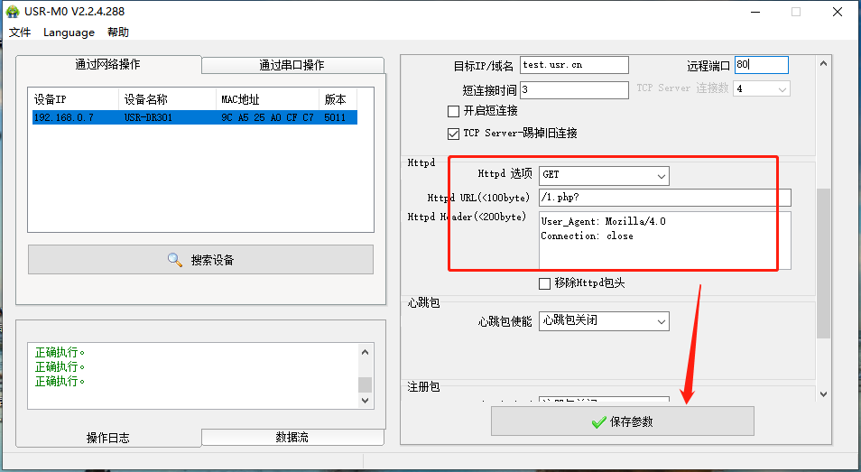 點(diǎn)擊“搜索設(shè)備”當(dāng)搜索列表中出現(xiàn)301的設(shè)備后,單擊搜索到的設(shè)備,IP設(shè)置為DHCP,模塊設(shè)置為Httpd Client模式,請(qǐng)求方式GET,URL為/1.php?,設(shè)置服務(wù)器地址test.usr.cn,端口80,設(shè)置并保存所有參數(shù),重啟模塊。(本說(shuō)明文檔使用為有人測(cè)試服務(wù)器)