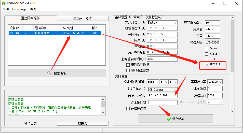 點(diǎn)擊“搜索設(shè)備”當(dāng)搜索列表中出現(xiàn)302的設(shè)備后,單擊搜索到的設(shè)備,查看其配置信息,勾選RFC2217,工作方式:TCP Client,目標(biāo)IP:92.168.0.201,遠(yuǎn)程端口8234。設(shè)置完成后點(diǎn)擊保存參數(shù)。