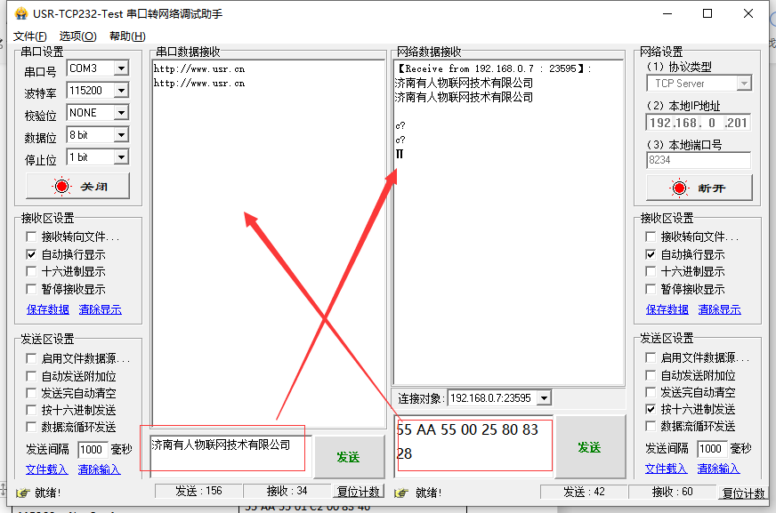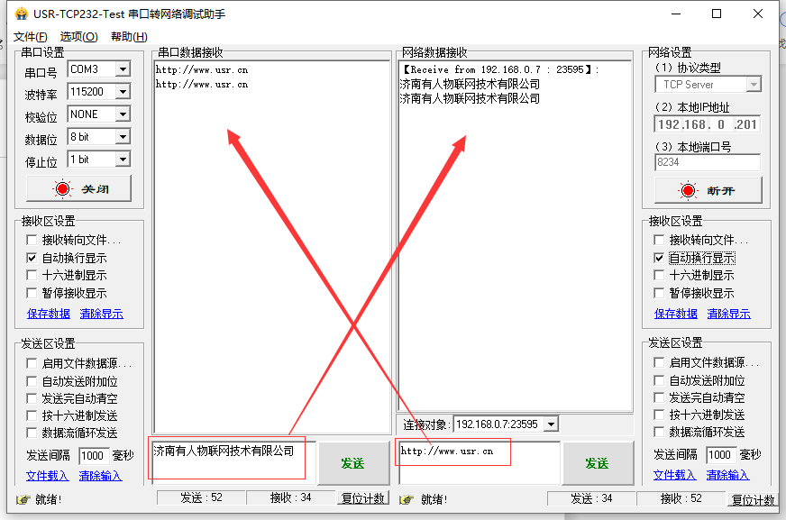 網(wǎng)絡(luò)端設(shè)置:由于設(shè)備默認(rèn)協(xié)議類型為TCP Client,所以電腦端連接設(shè)備需要設(shè)置為TCP server。服務(wù)器IP設(shè)置為電腦IP:192.168.0.201。端口號設(shè)置為302默認(rèn)參數(shù)中的“遠(yuǎn)程端口”:8234。