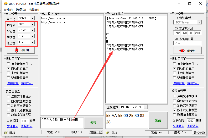 將模塊串口參數(shù)修改為9600、NONE、8、1,需要網(wǎng)絡(luò)端按十六進(jìn)制下發(fā)55 AA 55 00 25 80 83 28,發(fā)送完成后,軟件打開串口需要修改為9600、NONE、8、1, 不然數(shù)據(jù)會顯示為亂碼。