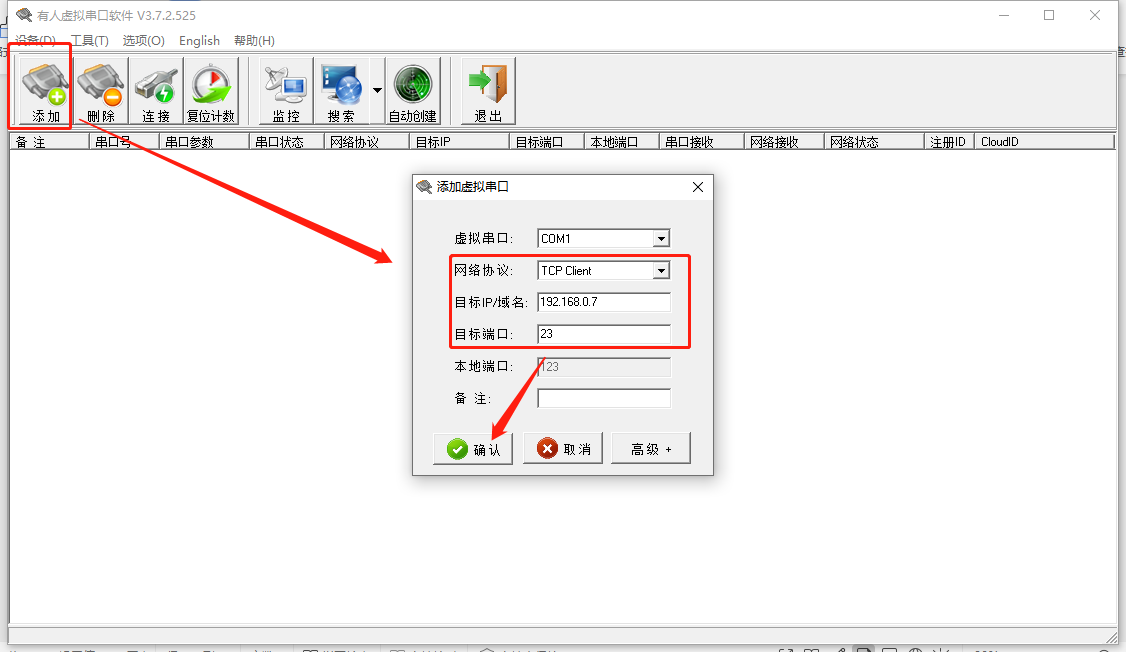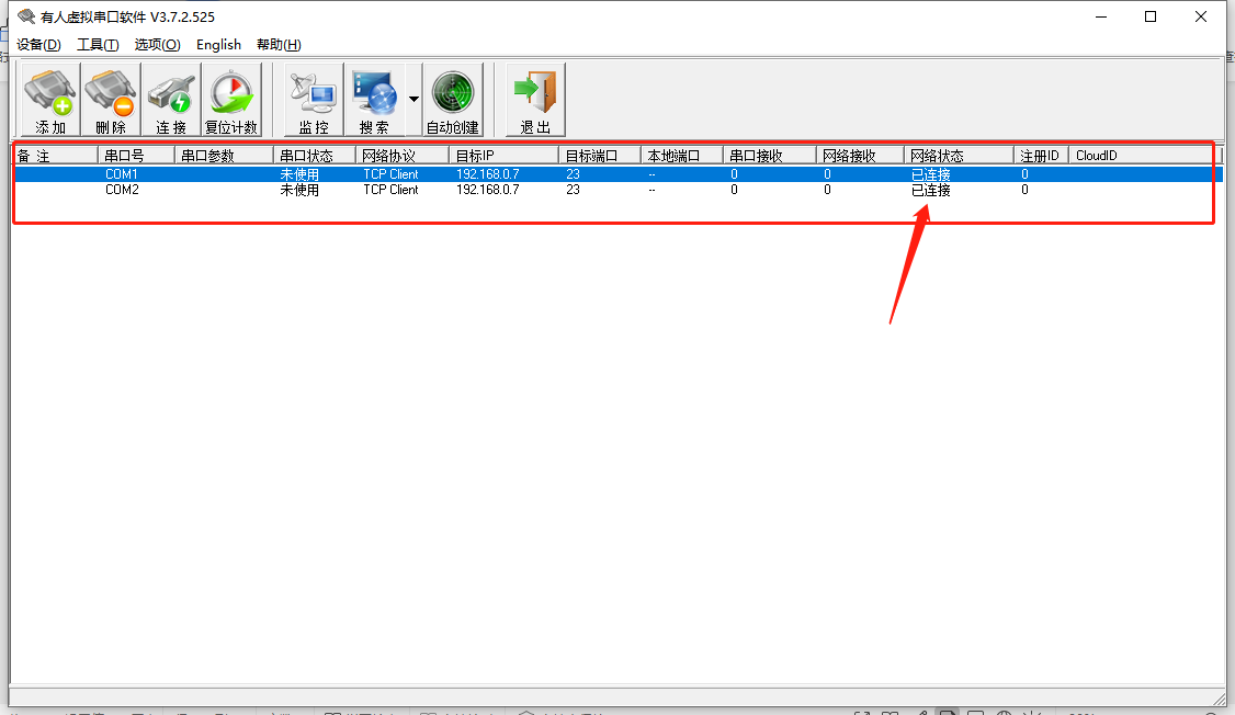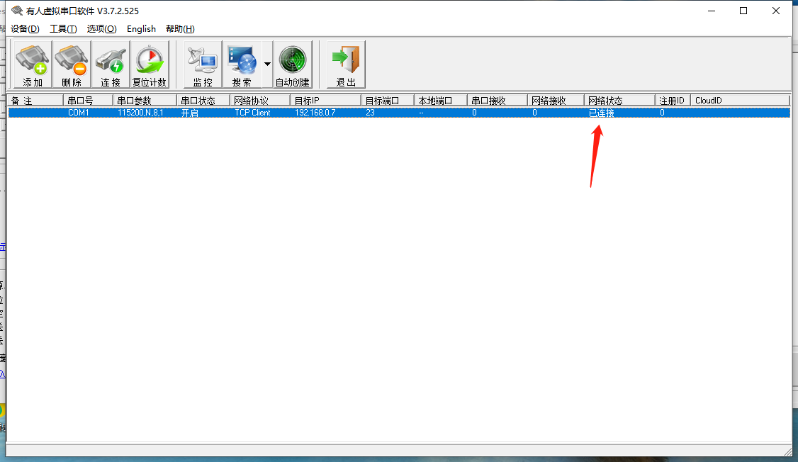 點擊“添加”,添加一個新的虛擬串口COM1,協(xié)議類型選擇TCP Client,目標(biāo)IP為302的默認(rèn)IP:192.168.0.7,目標(biāo)端口為302的本地端口:23,填寫完成后點擊確定??梢钥吹叫绿砑拥奶摂M串口顯示已連接。