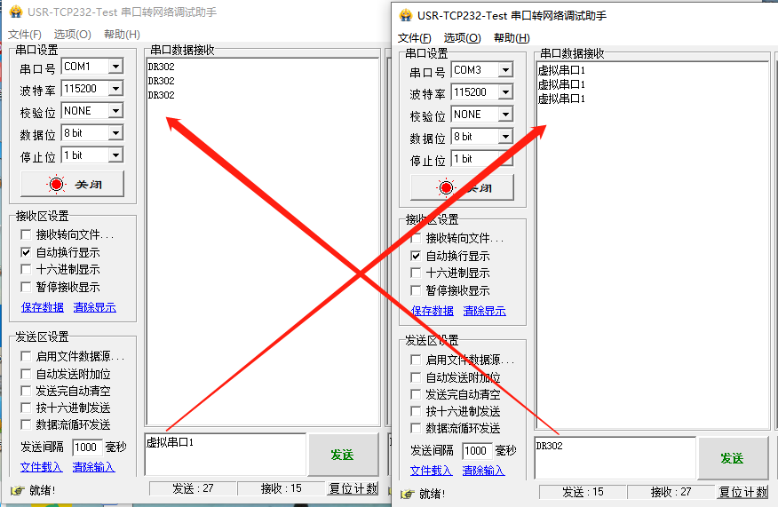 打開兩個串口調(diào)試助手,分別選擇正確的串口以及串口參數(shù),互發(fā)數(shù)據(jù),可以分別看到數(shù)據(jù)的接收。