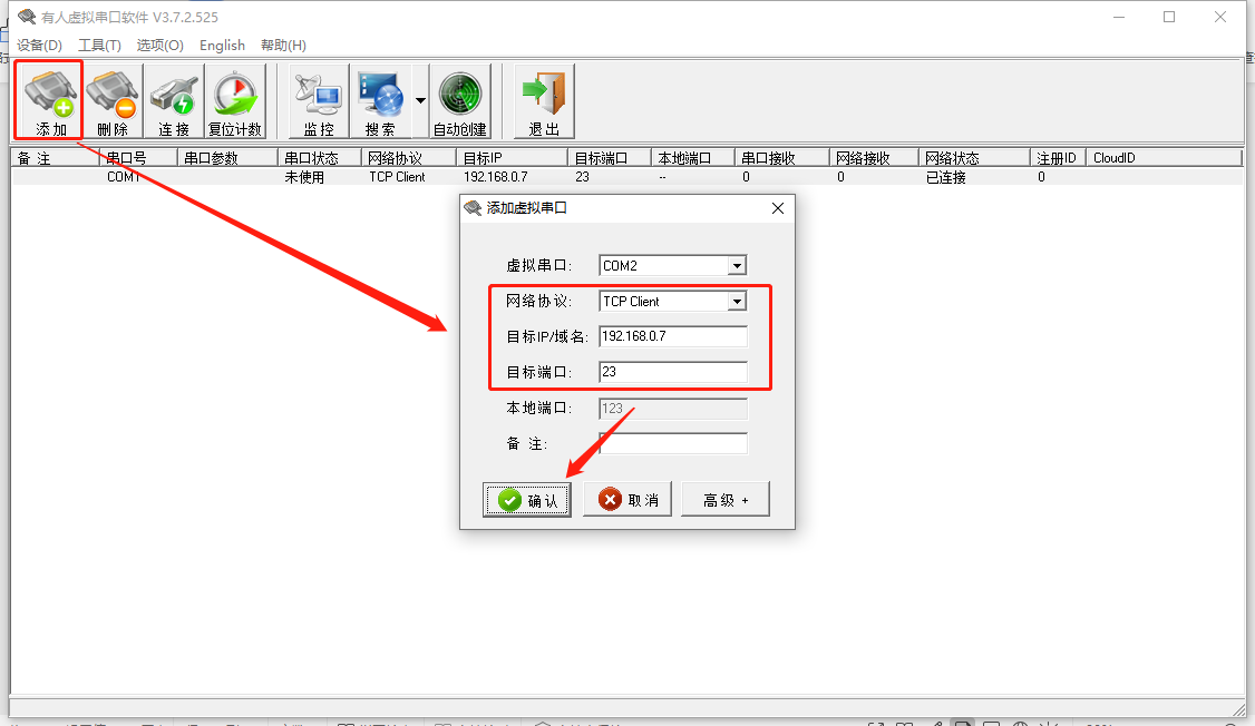 7、打開虛擬串口軟件,點擊“添加”,添加一個新的虛擬串口COM2,協(xié)議類型選擇TCP Client,目標(biāo)IP為302的默認(rèn)IP:192.168.0.7,目標(biāo)端口為302的本地端口:23,填寫完成后點擊確定??梢钥吹叫绿砑拥奶摂M串口顯示已連接。