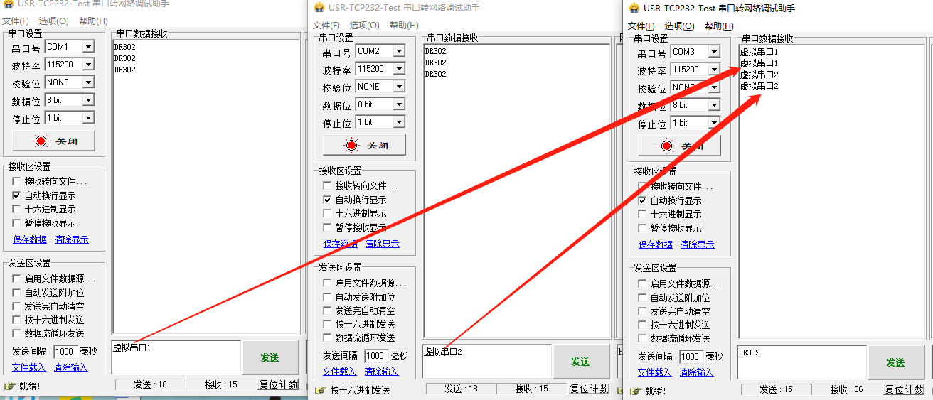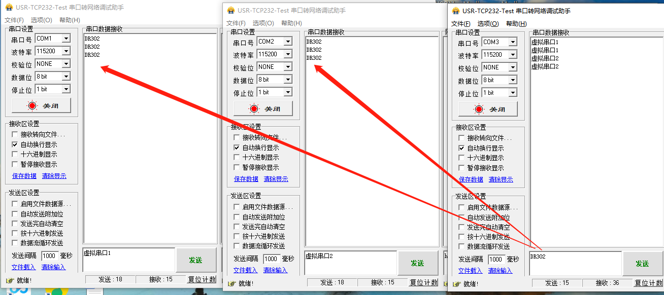 打開三個串口調(diào)試助手,分別選擇正確的串口以及串口參數(shù),互發(fā)數(shù)據(jù),可以分別看到數(shù)據(jù)的接收。