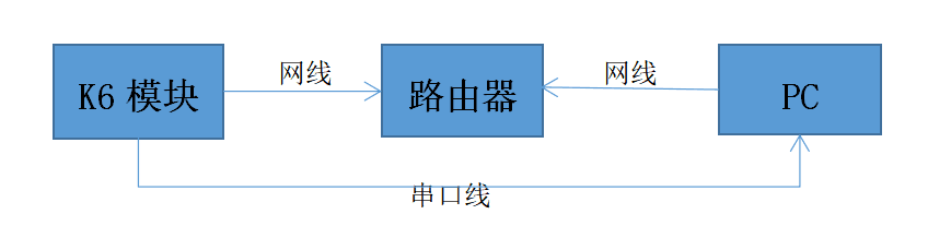 1.將 K6通過串口線(USB 轉(zhuǎn)RS232串口線)與計算機相連接,通過網(wǎng)線將 K6 的網(wǎng)口 與路由器相連接,PC也連接這個路由器,檢測硬件連接無錯誤后,接入5V電源適配器,給K7供電。觀察K6網(wǎng)口指示燈狀態(tài)是否正常:綠色燈常亮,黃色燈閃爍。