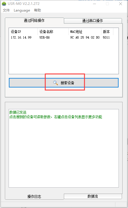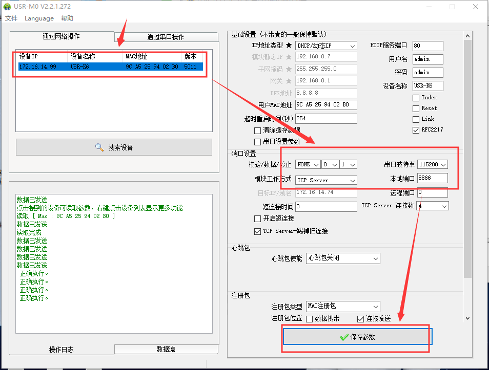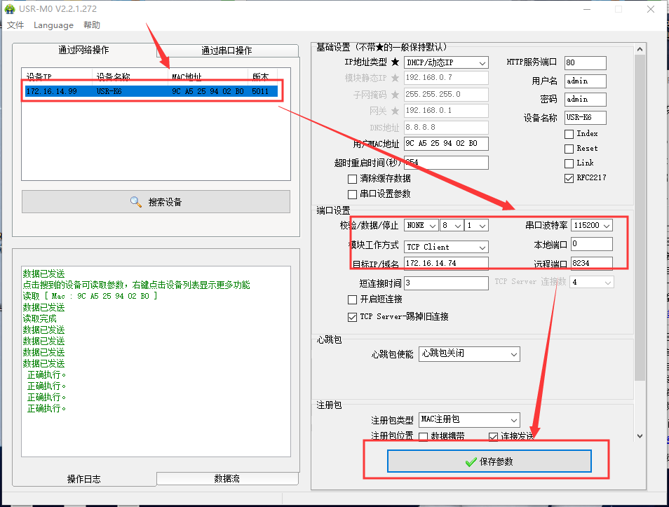 點擊“搜索設(shè)備”當搜索列表中出現(xiàn)K6的設(shè)備后,單擊搜索到的設(shè)備,查看其配置信息,工作方式選擇TCP Client,目標ip為PC的本地IP:172.16.14.74,遠程端口為PC的本地端口號:8234