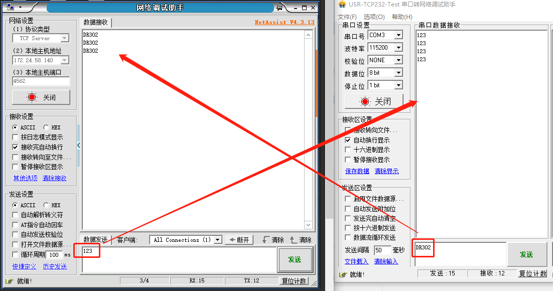 5、打開(kāi)串口》調(diào)試助手,串口參數(shù)和DR302的串口參數(shù)保持一致,打開(kāi)串口,即可和服務(wù)器建立通信。