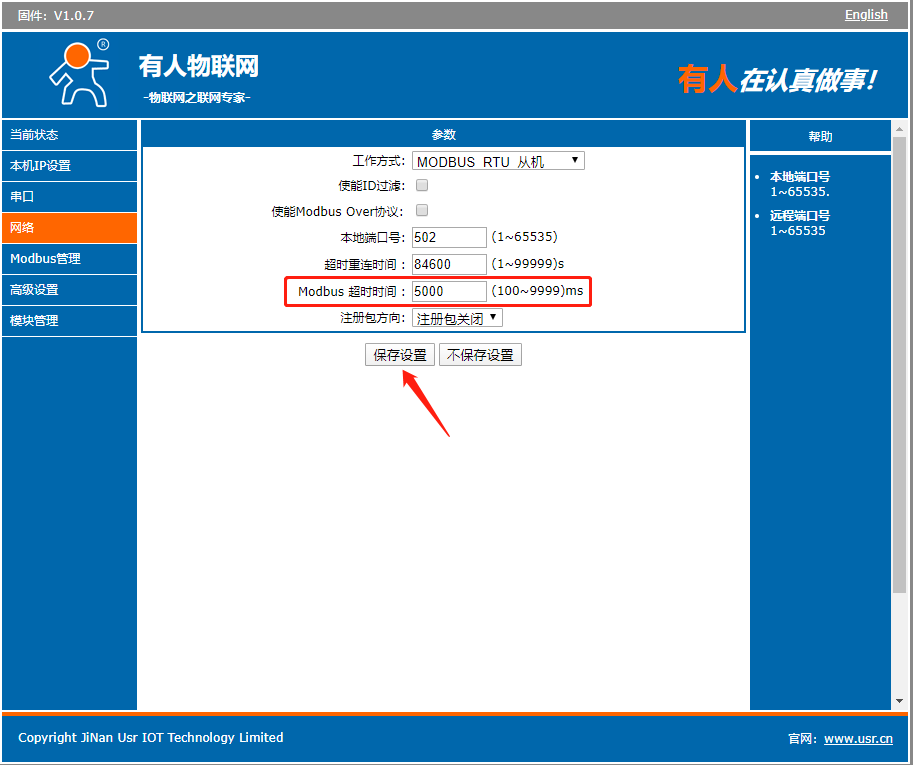 6、網(wǎng)絡(luò)里面的MODBUS 超時(shí)時(shí)間設(shè)置大一點(diǎn),可以設(shè)置成5000。點(diǎn)擊保存設(shè)置。