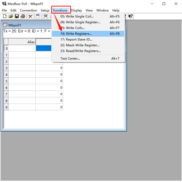 11、modbuspoll軟件點(diǎn)擊Funtions,選擇16:Write Registers