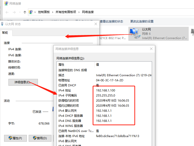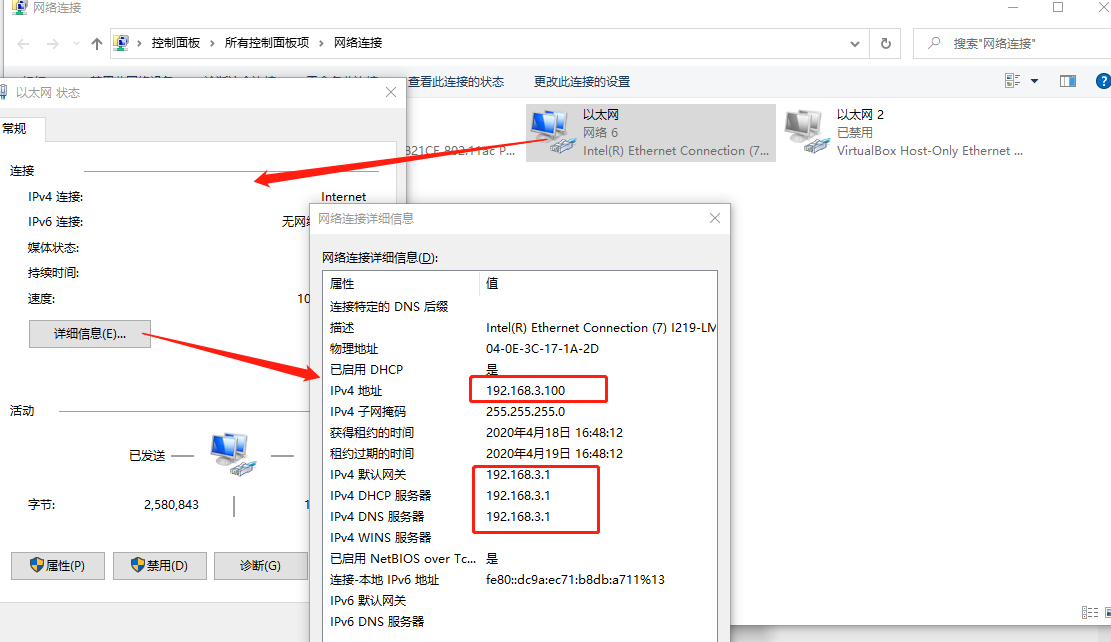 2) 雙擊該網(wǎng)卡,顯示詳細(xì)信息,查看電腦獲取的IP