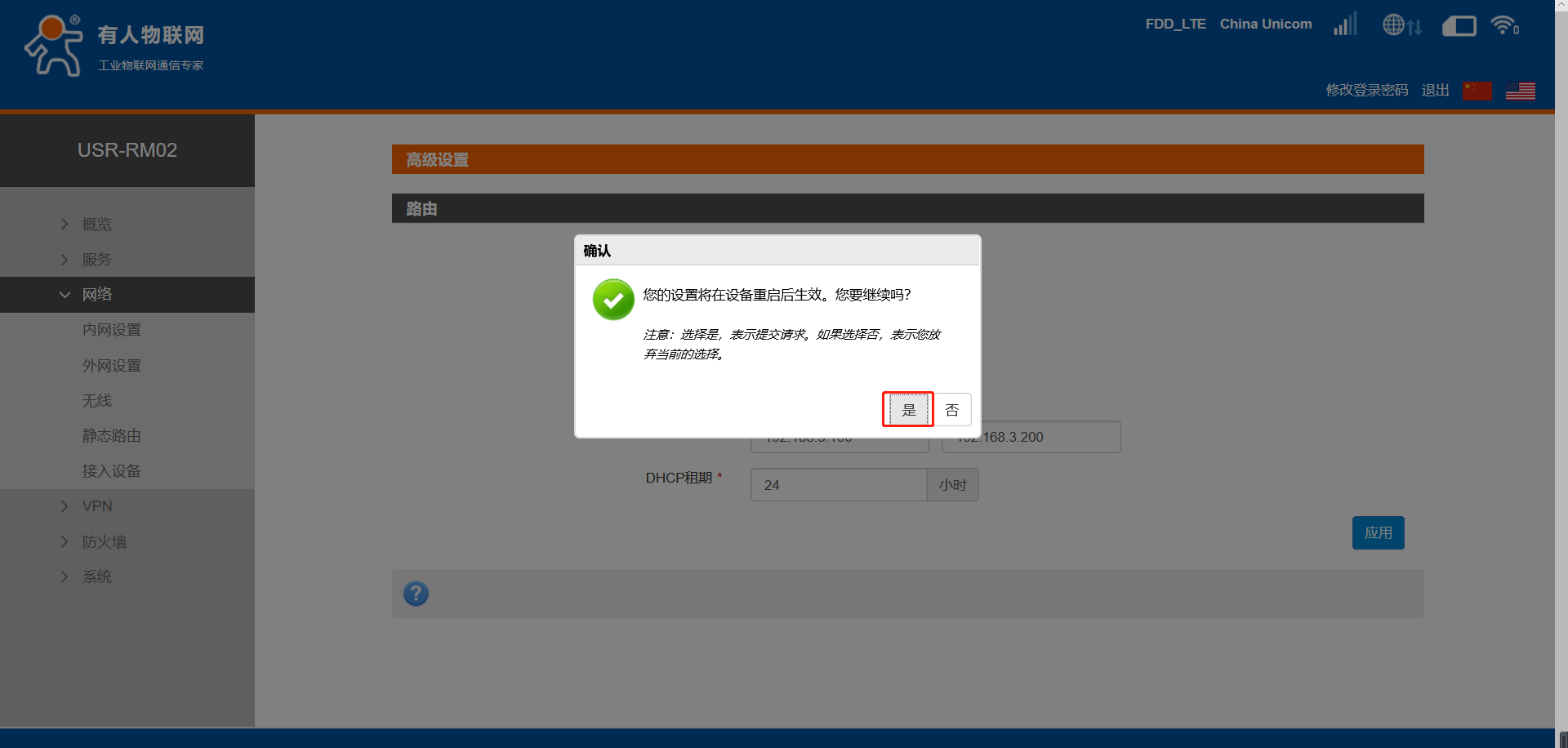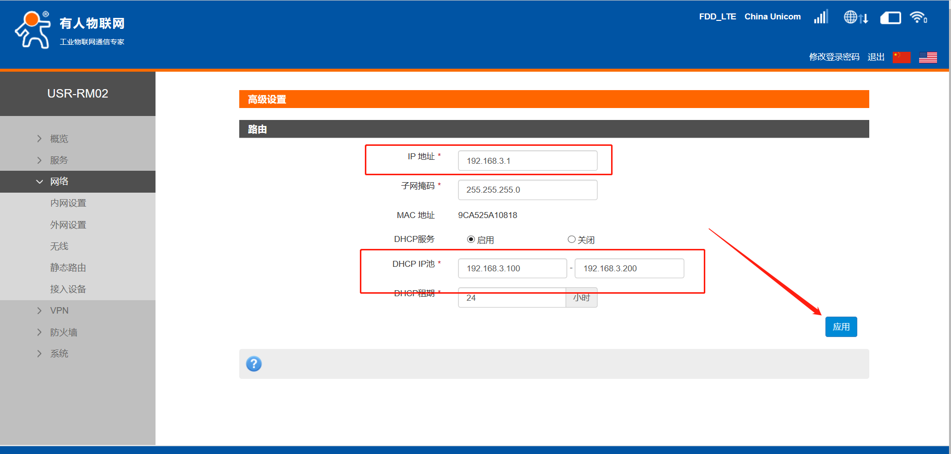 1、進(jìn)入網(wǎng)絡(luò)--內(nèi)網(wǎng)設(shè)置,進(jìn)入修改界面,出廠默認(rèn),RM02的LAN口IP為192.168.1.1