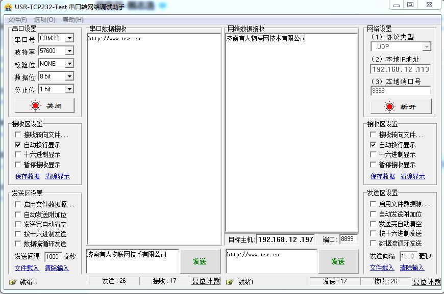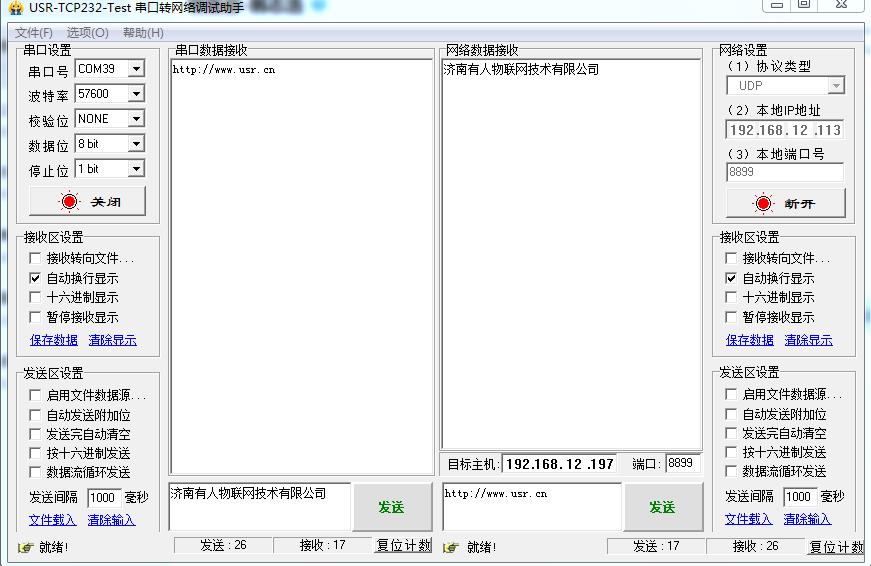 在電腦上用USR-TCp232-TEST軟件測試,打開COM口,網(wǎng)絡(luò)端設(shè)置參數(shù)。