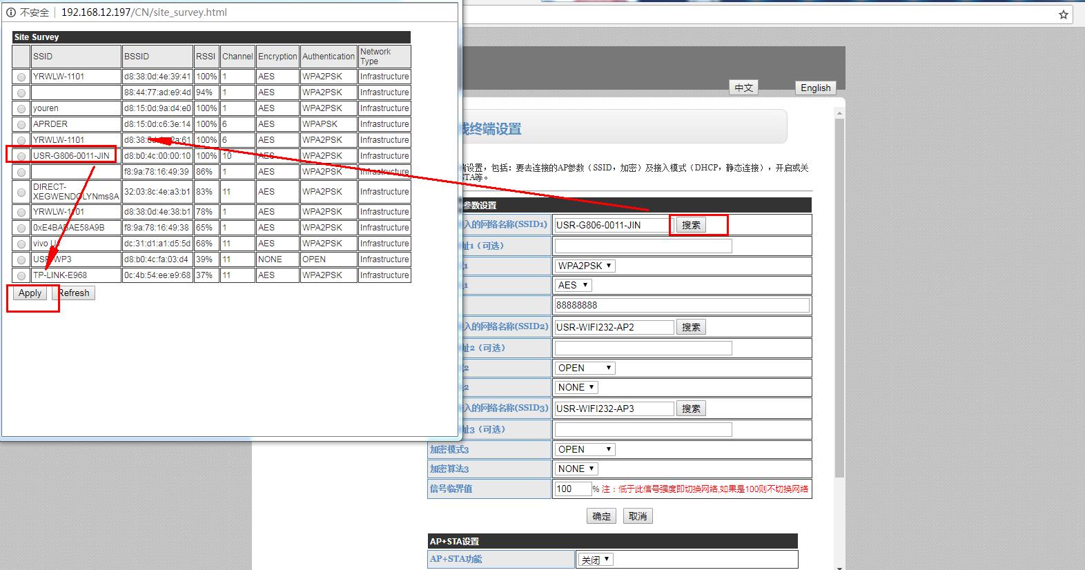 在無線終端設(shè)置中,點(diǎn)擊模塊要接入的網(wǎng)絡(luò)名稱SSID,可以手動輸入B2模塊設(shè)置STA模式要連接路由器wifi的名稱,或者點(diǎn)擊后面的搜索,搜索路由器的wifi,勾選,并點(diǎn)擊AppLY應(yīng)用。