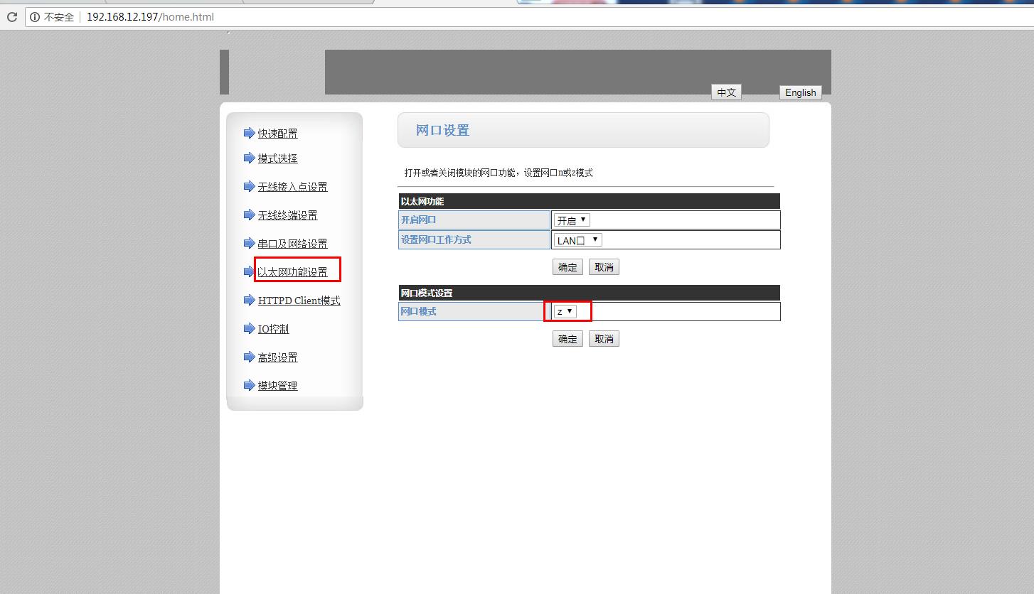 第一步:在以太網(wǎng)功能設(shè)置,網(wǎng)口工作模式是LAN口,網(wǎng)口模式設(shè)置Z。就是橋接模式。默認(rèn)是n模式,需要改為z模式。點(diǎn)擊確定。