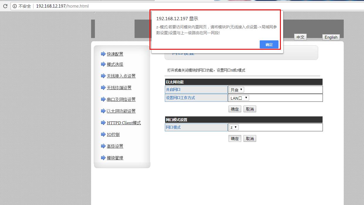會跳出提示對話框,z-模式:若要訪問模塊內(nèi)置網(wǎng)頁,請將模塊Ip(無線接入點(diǎn)設(shè)置——》局域網(wǎng)參數(shù)設(shè)置)設(shè)置與上一級路由器再同一網(wǎng)段!