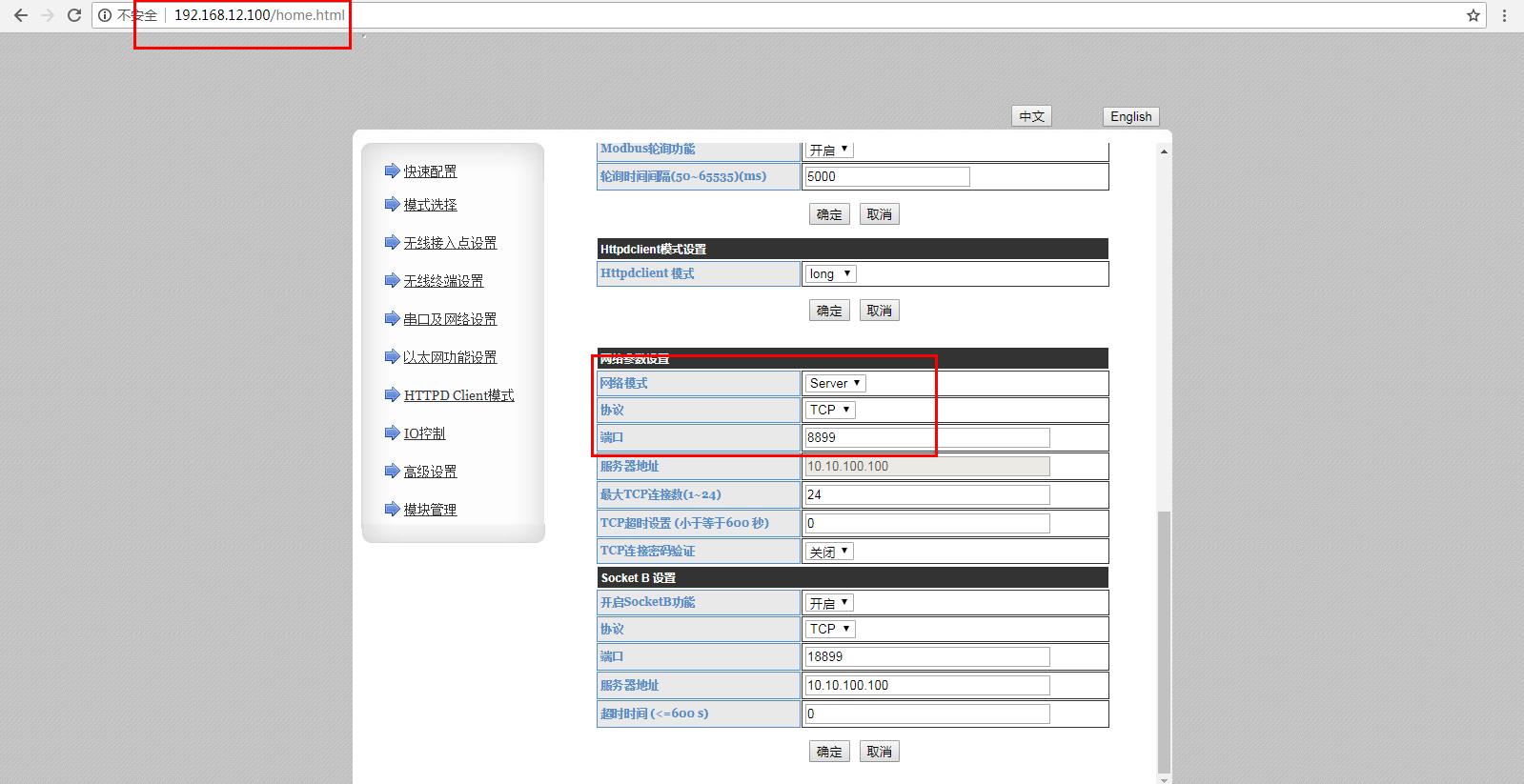 將B2模塊設(shè)置TCp server工作模式,端口8899。