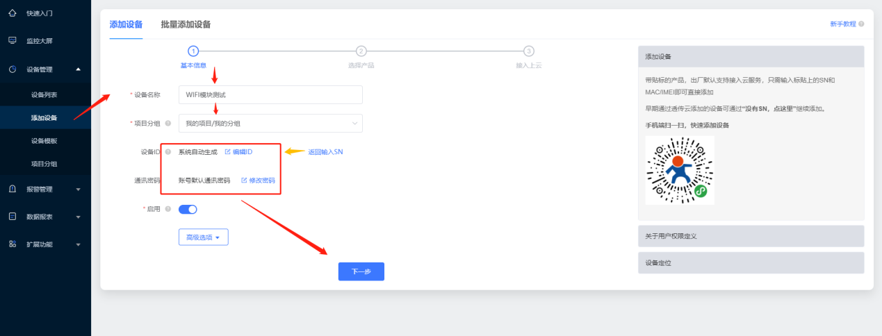 6、設(shè)置設(shè)備名稱,和項目分組,C322目前只能使用ID方式添加設(shè)備id,不能直接使用SN碼添加設(shè)備, 點擊“沒有SN,點這里”,使用設(shè)備id和密碼默認添加就可以,點擊一下步。