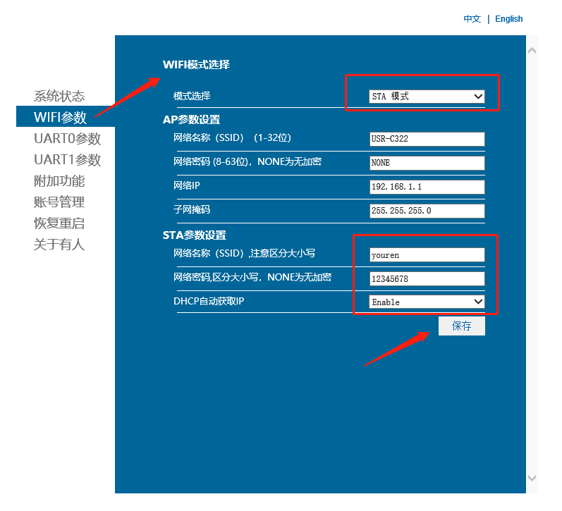 12、內(nèi)置網(wǎng)頁的賬號和密碼都是admin,進入以后選擇模式選擇模式選擇為sta模式,設(shè)置要連接的wifi名稱、密碼,點擊保存;(先不要重啟,等設(shè)置完所有的參數(shù)再重啟設(shè)備)。