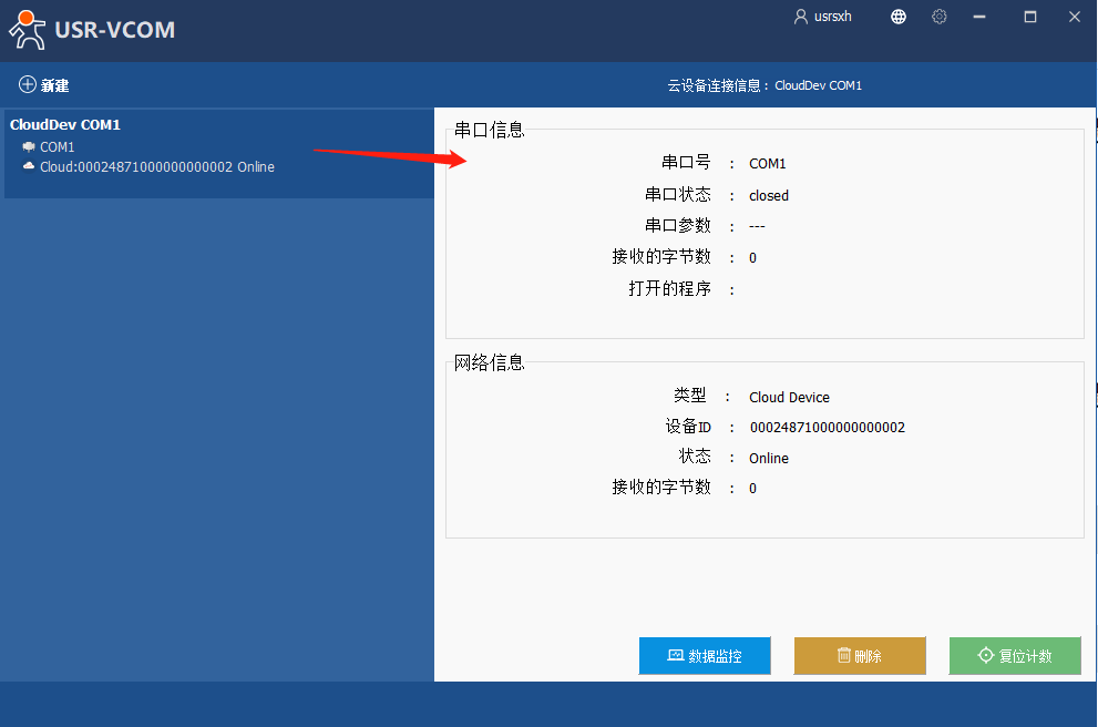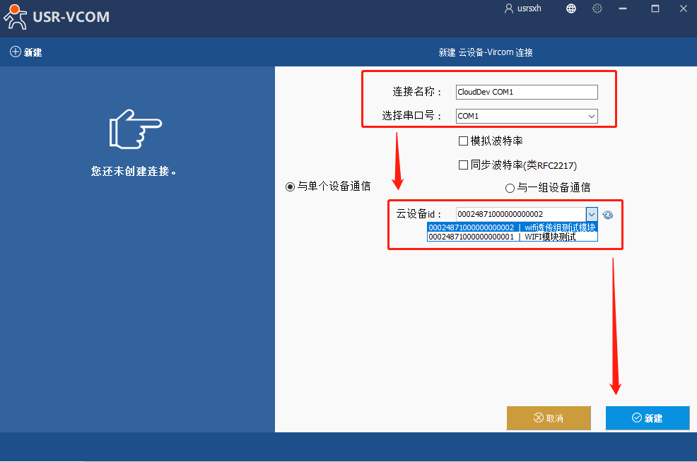 17、選擇一個沒有使用串口號,選擇云端剛才添加的設(shè)備,點新建,生成設(shè)備對應(yīng)的虛擬串口。