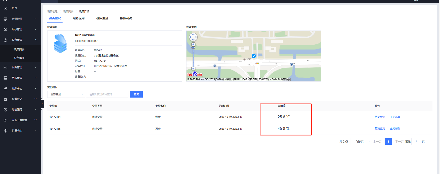 點擊設(shè)備管理--設(shè)備列表,點擊設(shè)備名稱即可看到當前變量數(shù)據(jù)。