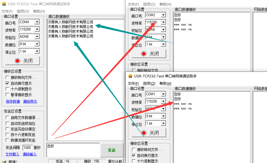 然后用兩個USR-TCp232-TEST測試串口和虛擬串口之間的數(shù)據(jù)傳輸。