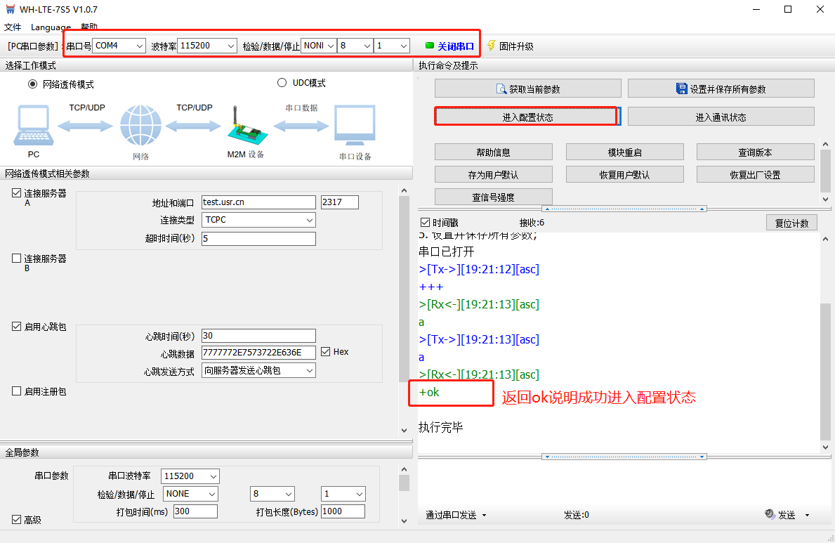 打開串口,進(jìn)入配置狀態(tài),返回ok說明進(jìn)入配置狀態(tài)成功