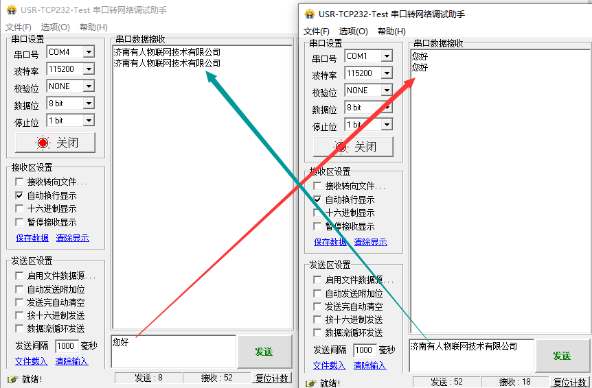 然后用USR-TCp232-TEST測試串口和虛擬串口之間的數(shù)據(jù)傳輸。