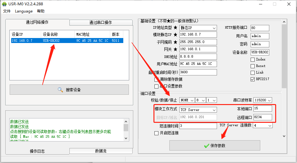 4、打開設置軟件,點擊“搜索設備”當搜索列表中出現(xiàn)302的設備后,點擊搜索到的設備,模塊工作方式設為TCP SERVER,本地端口15,點擊保存參數(shù)。