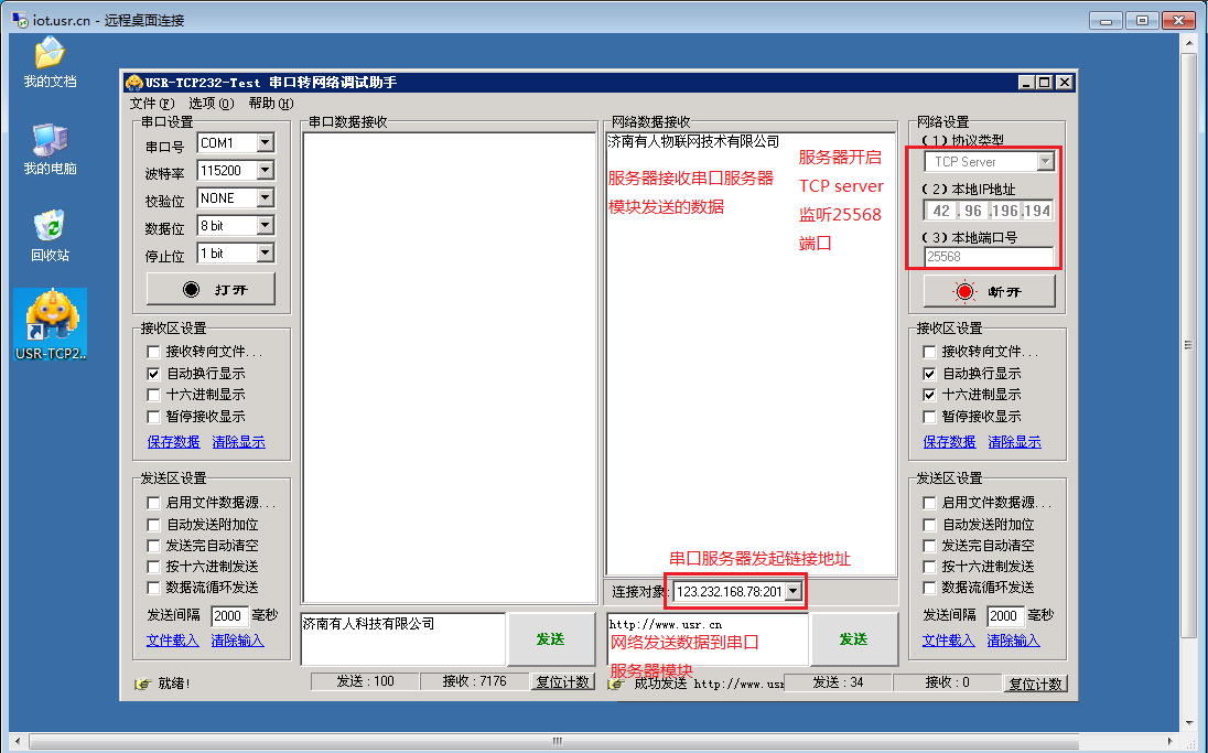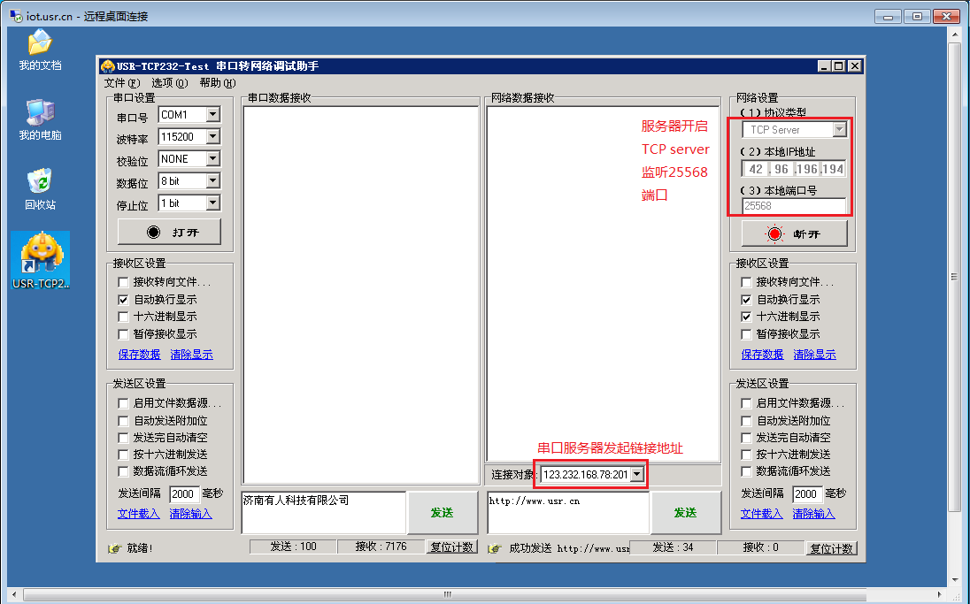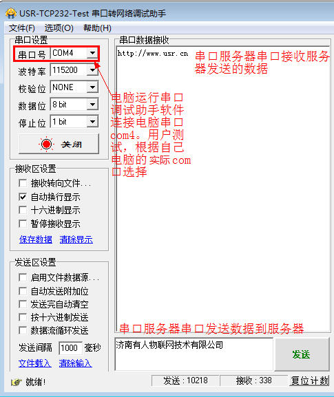以上是服務(wù)器發(fā)送數(shù)據(jù)和接收數(shù)據(jù):以下使用電腦串口連接串口服務(wù)器串口,電腦運行串口調(diào)試軟件,進(jìn)行發(fā)送和接收服務(wù)器的數(shù)據(jù)。