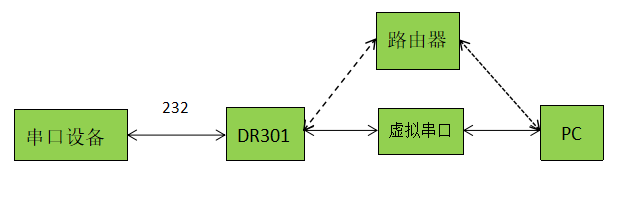 1、將301(USR-DR301,簡稱301)的串口通過串口線(或USB 轉(zhuǎn)串口線)與pC相連接,通過網(wǎng)線將串口服務(wù)器DR301的網(wǎng)口pC的網(wǎng)口相連接,檢測硬件連接無錯誤后,接入我們配送的電源適配器,給301供電。