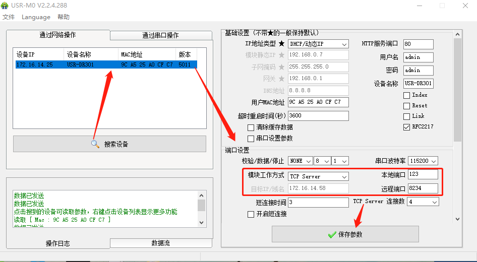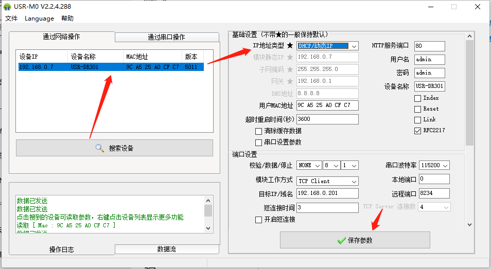 點(diǎn)擊“搜索設(shè)備”當(dāng)搜索列表中出現(xiàn)301的設(shè)備后,單擊搜索到的設(shè)備,右邊基礎(chǔ)設(shè)置,在“Ip地址類型”將靜態(tài)Ip改為DHCp動態(tài)獲取,點(diǎn)擊保存參數(shù)。