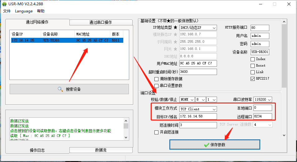 5、301和pC均連接同一個路由器,點(diǎn)擊“搜索設(shè)備”,可以看到,301的Ip為路由器分配的Ip:172.16.14.25。