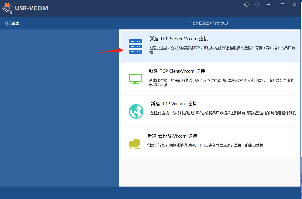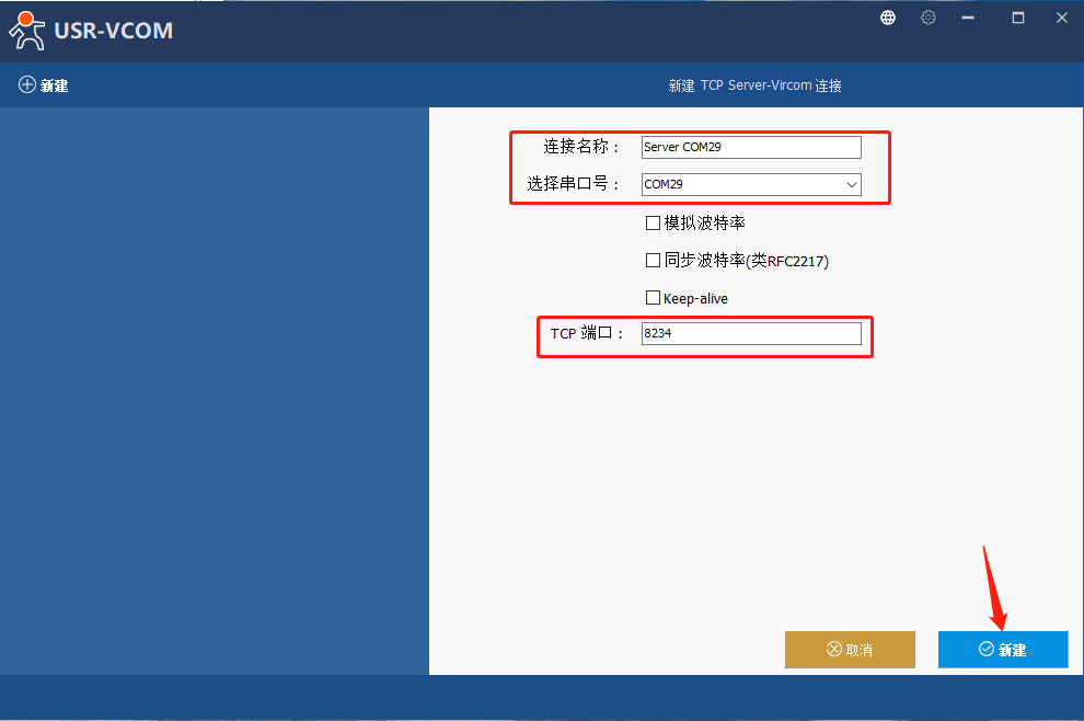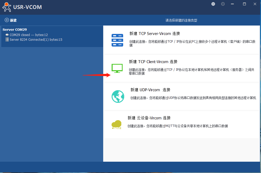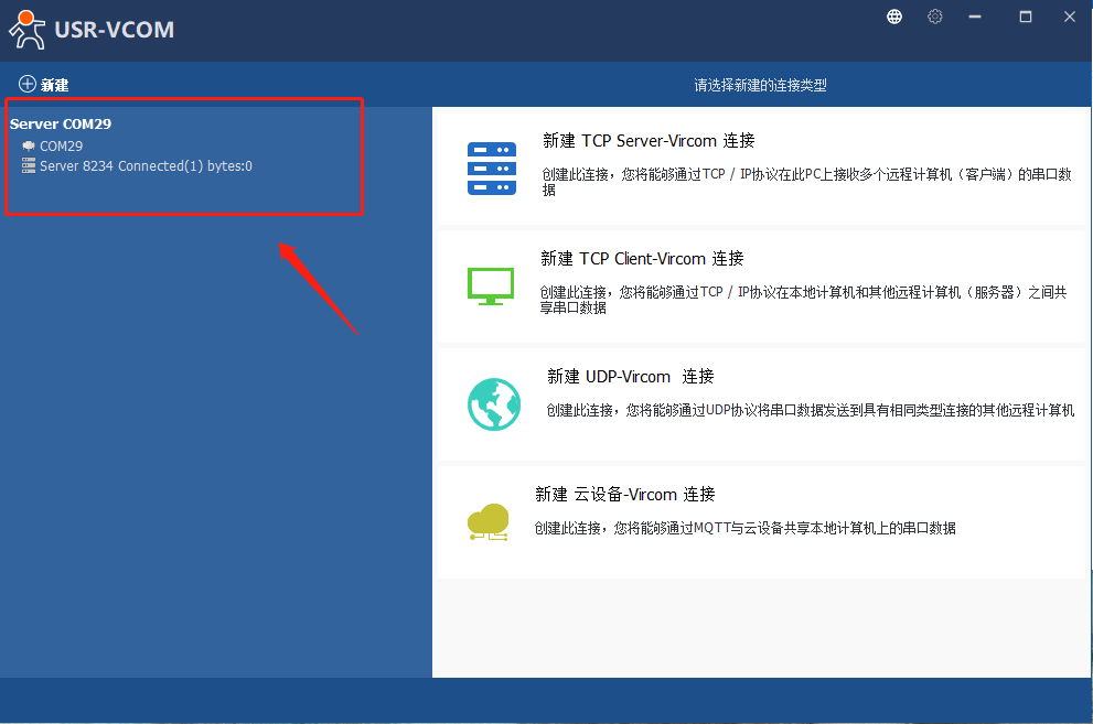 6、打開虛擬串口軟件,點(diǎn)擊“新建TCpServer-Vircom連接”,選擇新的串口號(為了避免串口沖突,盡量往大選),此處以COM29為例,TCp端口設(shè)為8234,點(diǎn)擊新建,可以看到自己剛剛創(chuàng)建的虛擬串口。