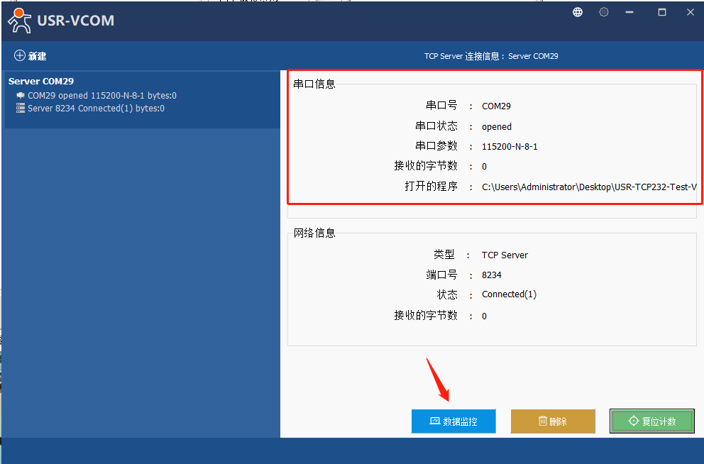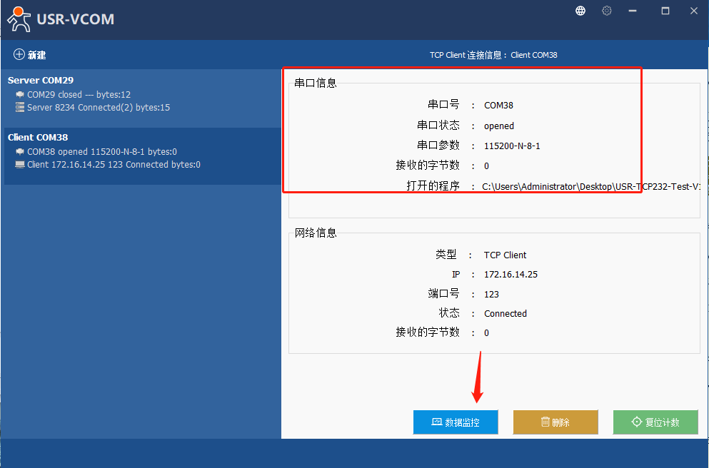 12、點(diǎn)擊新建立的虛擬串口,可以看到網(wǎng)絡(luò)信息狀態(tài)顯示Connected,代表已經(jīng)建立連接。