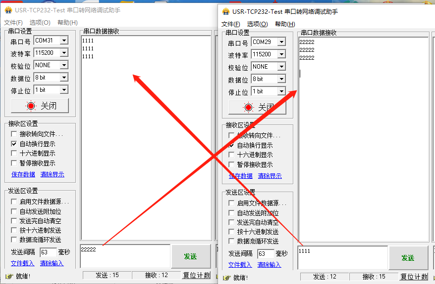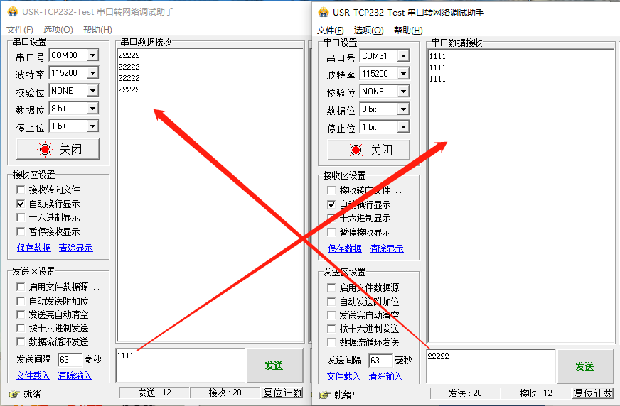 13、打開兩個串口調(diào)試助手軟件,串口端選擇正確的串口(設(shè)備插在電腦上所識別到的COM口可在設(shè)備管理器--端口處查看)以及串口參數(shù),301出廠默認(rèn)115200,N,8,1。打開創(chuàng)建的虛擬串口后,虛擬串口界面顯示串口信息為:Opened。