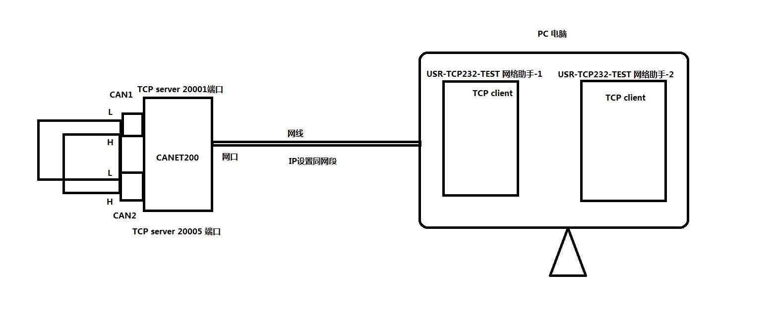 CANET200網(wǎng)口用網(wǎng)線連接電腦網(wǎng)口,電腦IP和USR-CANET200的IP設(shè)置同一網(wǎng)段。