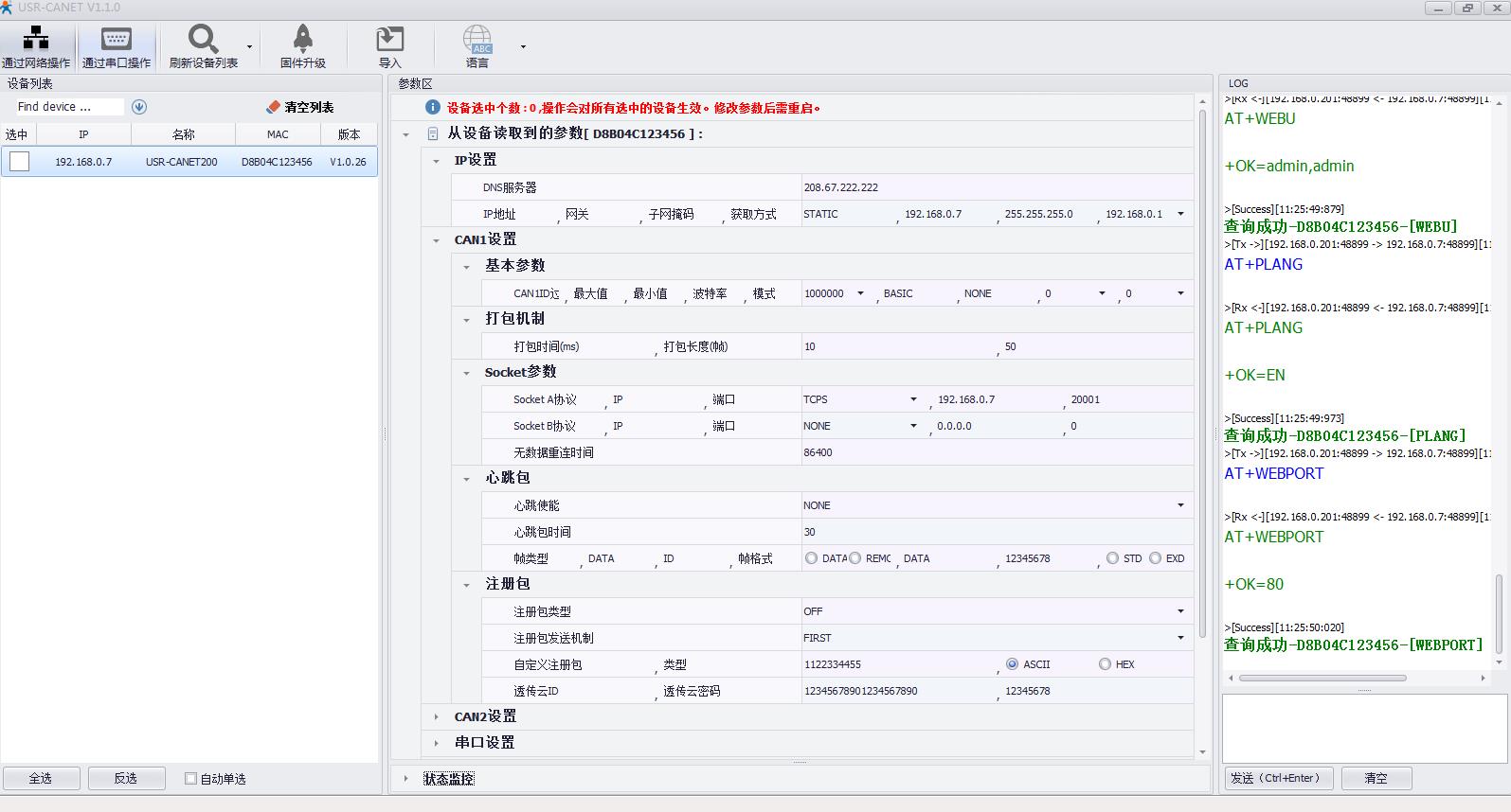 CAN1默認(rèn)是TCP server模式,本地端口20001