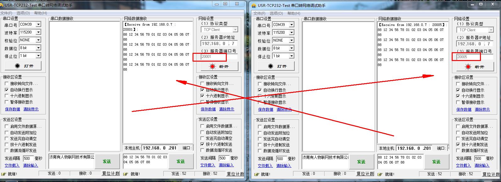 在電腦下載,并安裝打開2個USR-TCP232-TEST 串口網(wǎng)絡(luò)助手。