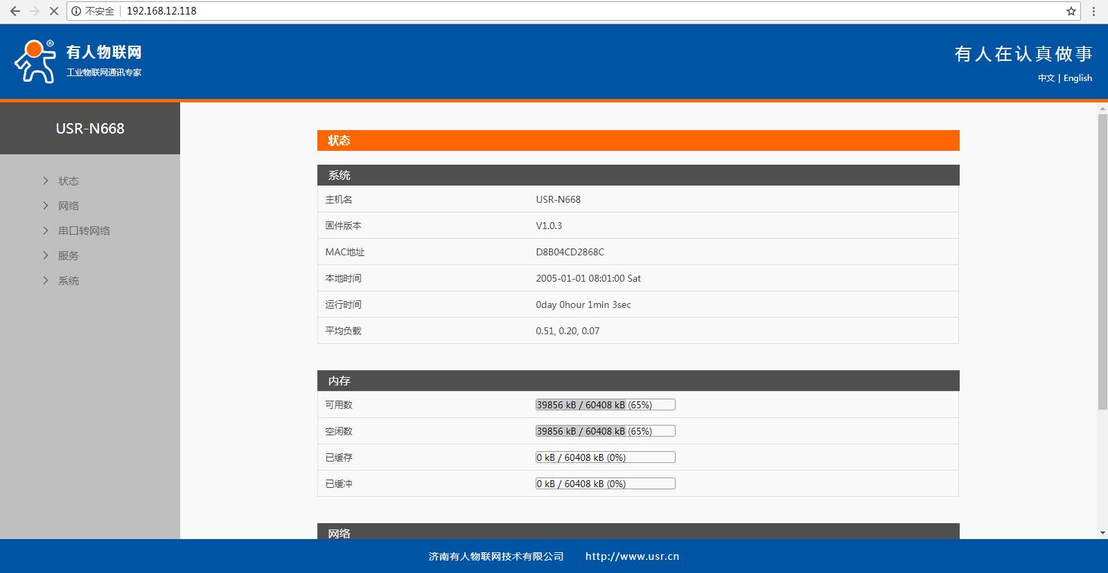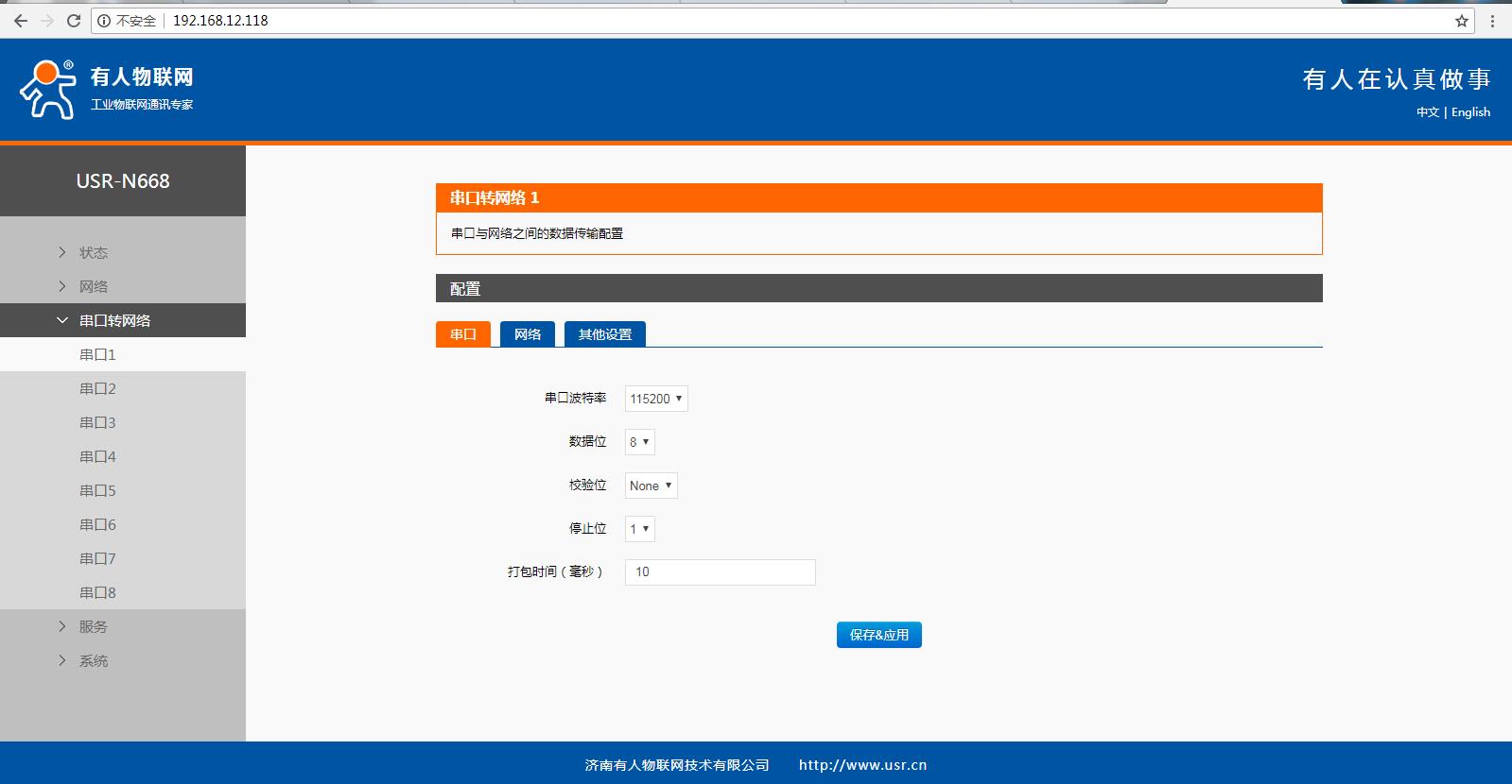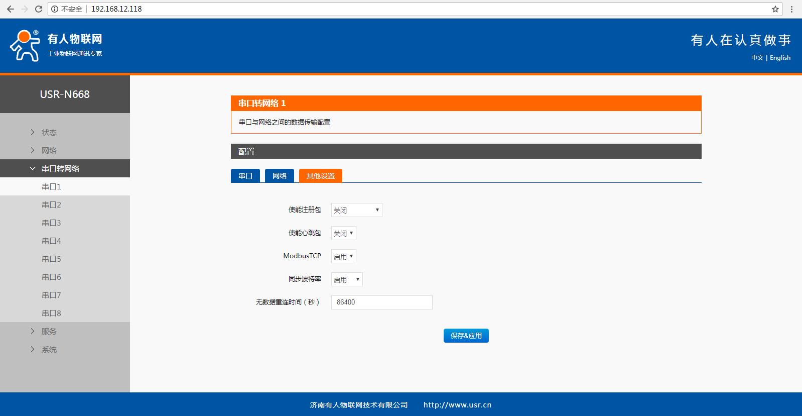 在瀏覽器輸入N668的IP,可以登錄N668的內(nèi)置網(wǎng)頁。設(shè)置串口一參數(shù)工作方式TCP server 本地端口20001 開啟MODBUS TCP功能。網(wǎng)頁設(shè)置參數(shù)完成之后,重啟N668。