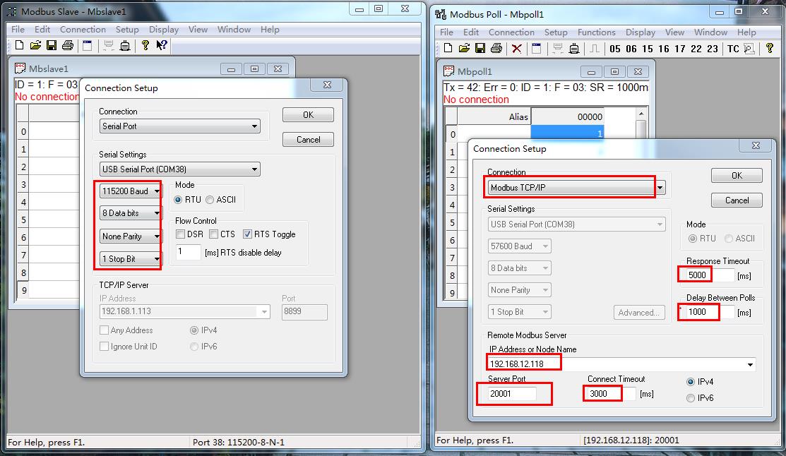 在電腦下載,并安裝打開MODBUS SLAVE和MODBUS POLL 軟件。軟件建立TCP連接,USB-RS232串口線接N668串口一和電腦,改變MODBUS SAVLE從機寄存器地址數(shù)據(jù),對應(yīng)MODBUS POLL 寄存器地址數(shù)據(jù)改變,就可以實現(xiàn)N668串口和網(wǎng)絡(luò)之間數(shù)據(jù)傳輸。