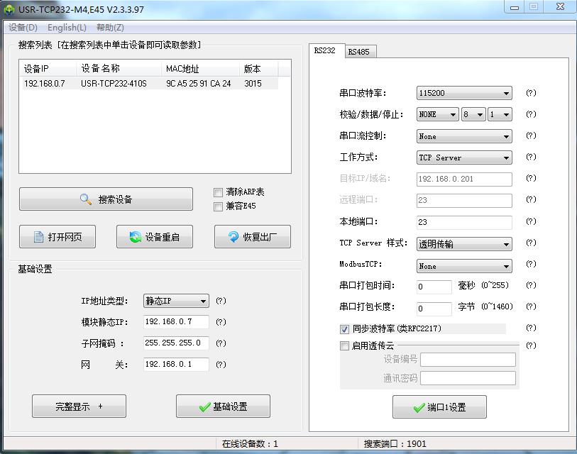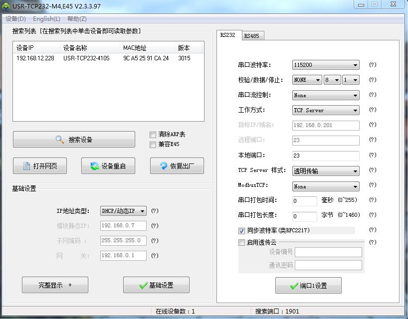 用M4設(shè)置軟件搜索USR-TCP232-410S的IP,192.168.0.7,USR-TCp232-410S用串口設(shè)置軟件設(shè)置DHCP,動態(tài)獲取IP。