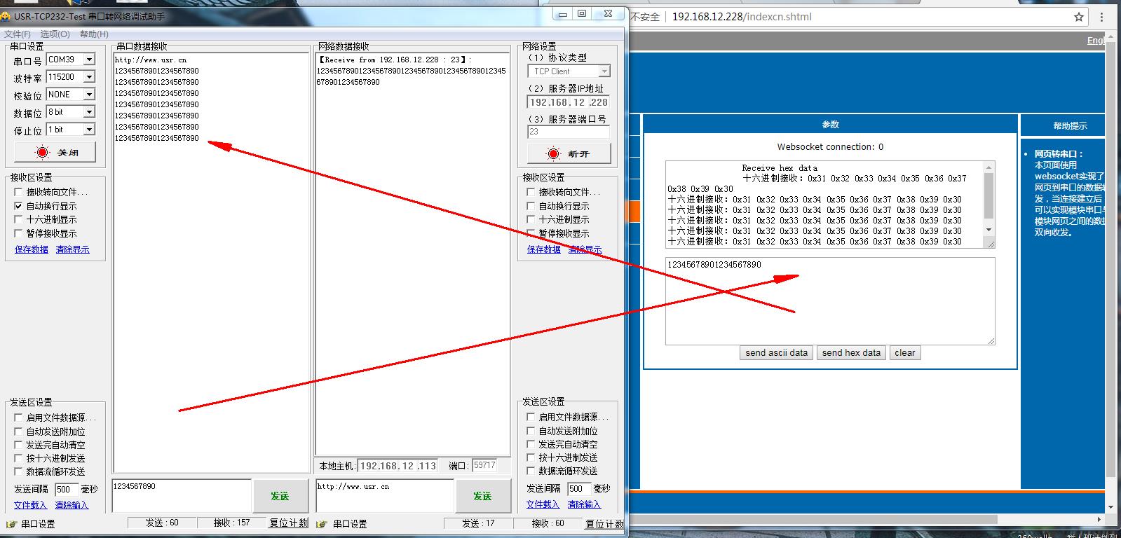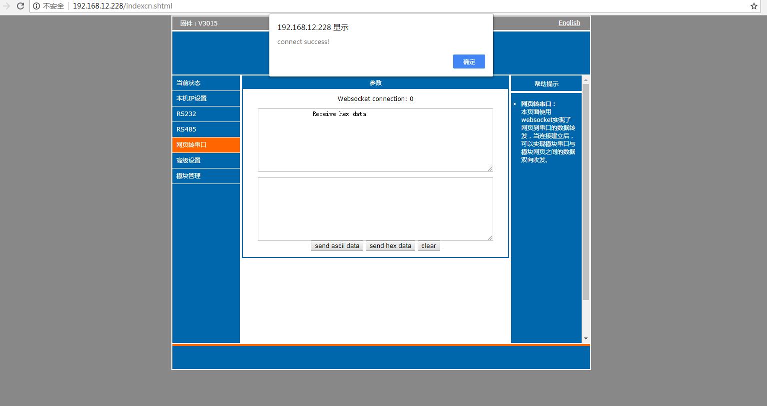 同時410S網(wǎng)頁打開websocket頁面,顯示連接成功,然后測試串口和websocket之間的數(shù)據(jù)傳輸。