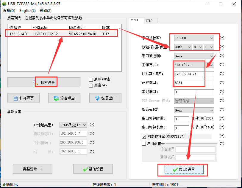 點(diǎn)擊“搜索設(shè)備”當(dāng)搜索列表中出現(xiàn)E2的設(shè)備后,單擊搜索到的設(shè)備,查看其配置信息,工作方式選擇TCp Client,目標(biāo)ip為pC的本地Ip:172.16.14.74,遠(yuǎn)程端口為pC的本地端口號(hào):8234,點(diǎn)擊端口設(shè)置保存參數(shù)。