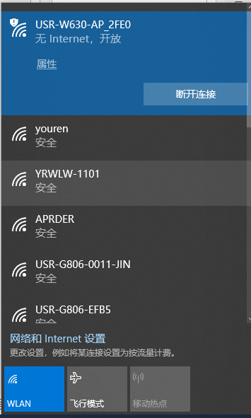 USR-W630(以下簡稱W630)接上供電電源,此時power指示燈亮起;將wifi串口服務(wù)器W630的串口通過串口線(USB轉(zhuǎn)232或者轉(zhuǎn)485)接到電腦上,裝上wifi天線,模塊正常啟動后,work指示燈每2s閃亮一次