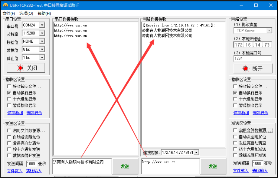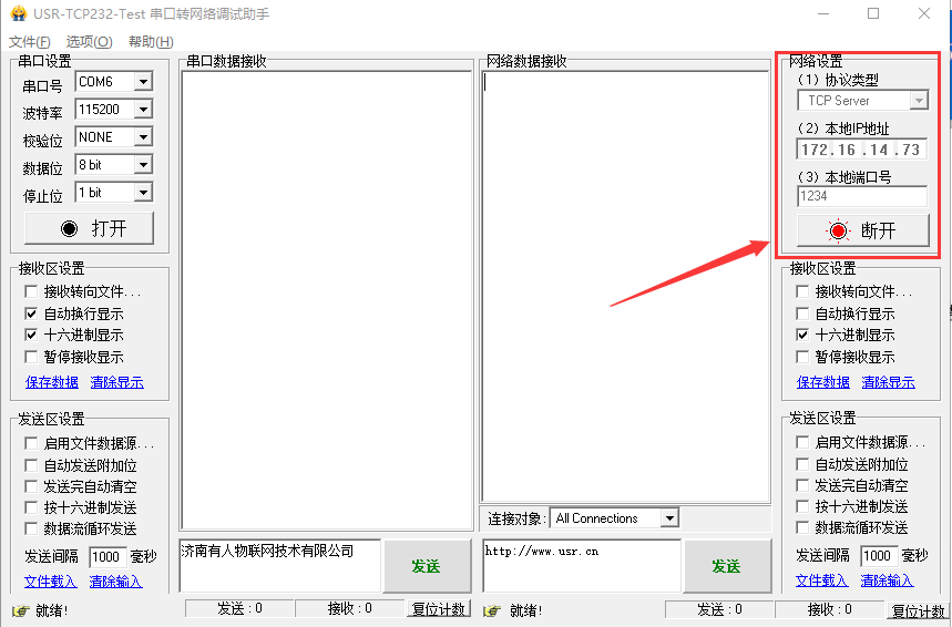 在USR-TCp232-Test軟件的串口端打開206的串口, 互發(fā)數(shù)據(jù)便可通信了。