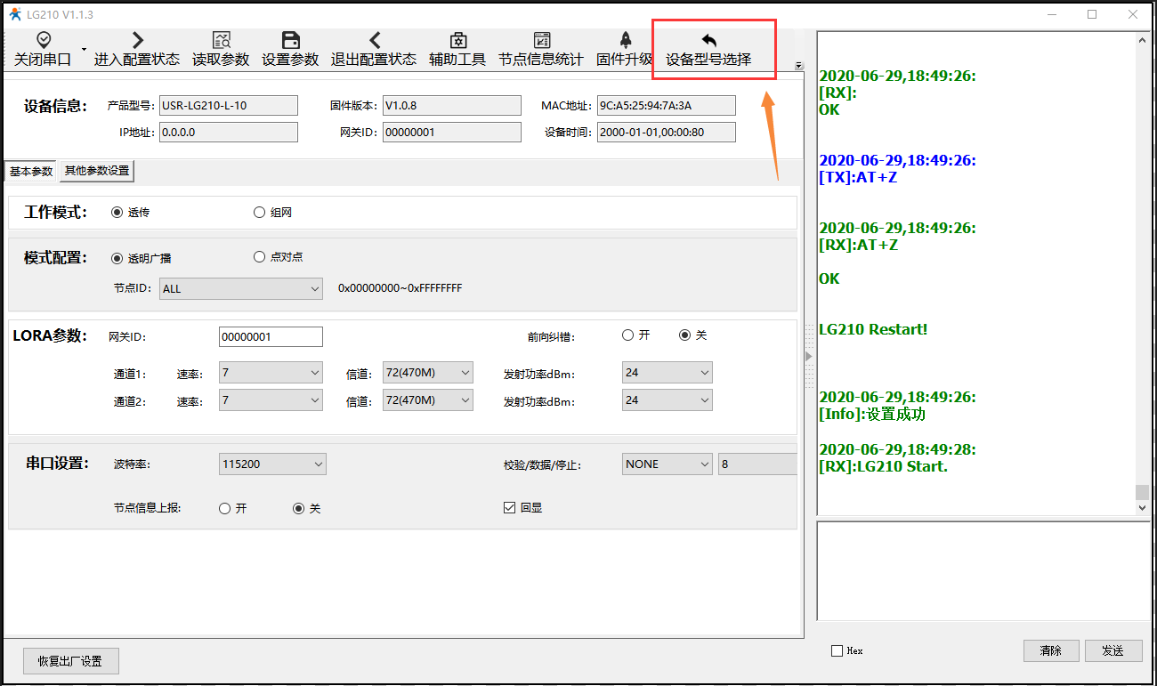 7) 配置LORA節(jié)點(diǎn)USR-LG206-L-C-H10,設(shè)置軟件設(shè)備選型選擇”LG206-L-p-H10”。